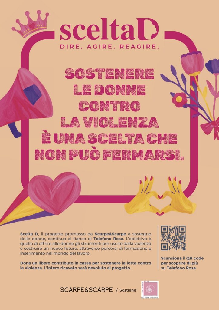 Con Scelta D, Scarpe&Scarpe ribadisce la volontà di contribuire non solo con risorse economiche, ma anche con un impegno culturale condiviso con clienti e collaboratori, nella convinzione che la lotta contro la violenza di genere richieda il coinvolgimento attivo dell’intera società.