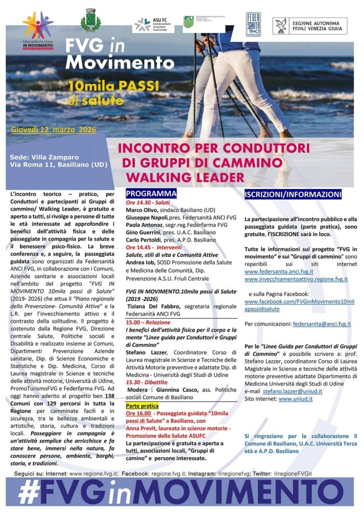 Giovedì 12 marzo, inizio ore 14.30, a Basiliano, a “Villa Zamparo”, in via Roma 11 si terrà l’incontro pubblico. teorico-pratico,per gruppi di cammino e presentazione del manuale per “Conduttori di Gruppi di Cammino/ Walking Leader” (Direzione centrale Salute). Al termine degli interventi, seguirà una passeggiata guidata lungo il percorso “Basiliano tra storia, arte e ambiente”.Il programma prevede: i saluti del sindaco, Marco Olivo,del presidente di Federsanità ANCI FVG, Giuseppe Napoli, della segretaria regionale di Federfarma FVG, Paola Antonaz e dei presidenti di U.A.C. Basiliano, Gino Guerrini e A.P.D. Basiliano, Carlo Pertoldi. Seguiranno brevi relazioni su “Salute, stili di vita e Comunità Attive”,Andrea Iob, SOSD Promozione della Salute e Medicina delle Comunità, Dipartimento di Prevenzione ASUFC e sul “Progetto regionale FVG IN MOVIMENTO. 10mila passi di Salute” (2019 -2026), 138 Comuni (su 215) per 129 percorsi, a cura di Tiziana Del Fabbro, segretaria regionale Federsanità ANCI FVG. La relazione principale “I benefici dell’attività fisica per il corpo e la mente ” e “Linee guida per Conduttori e Gruppi di Cammino”, sarà tenuta dal prof. Stefano Lazzer, coordinatore Corso di Laurea magistrale in Scienze e Tecniche delle Attività Motorie preventive e adattate, Dipartimento di Medicina, Università degli Studi di Udine. Seguirà il dibattito moderato da Giannina Casco, assessore alle Politiche sociali del Comune di Basiliano.