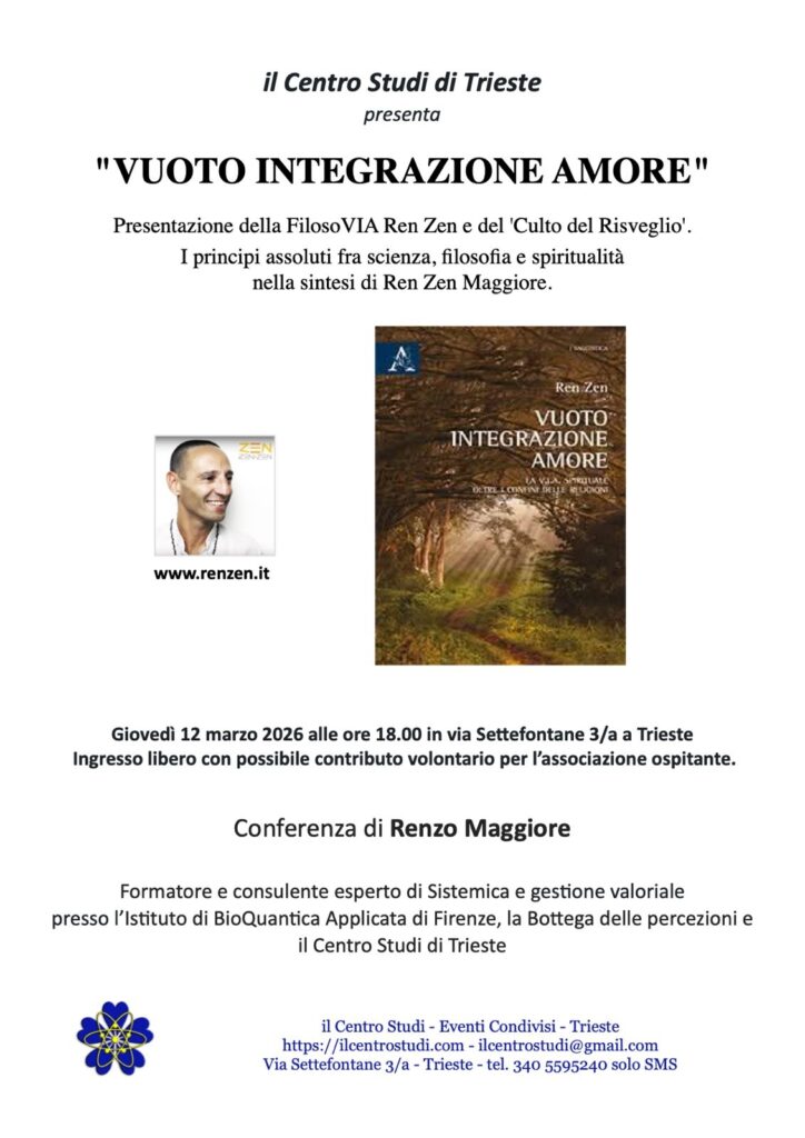 Giovedì 12 marzo alle ore 18.00 presso il “Centro Studi” di Trieste in via Settefontane 3/a con ingresso libero si terrà la presentazione del libro “Vuoto Integrazione Amore” di Ren Zen.