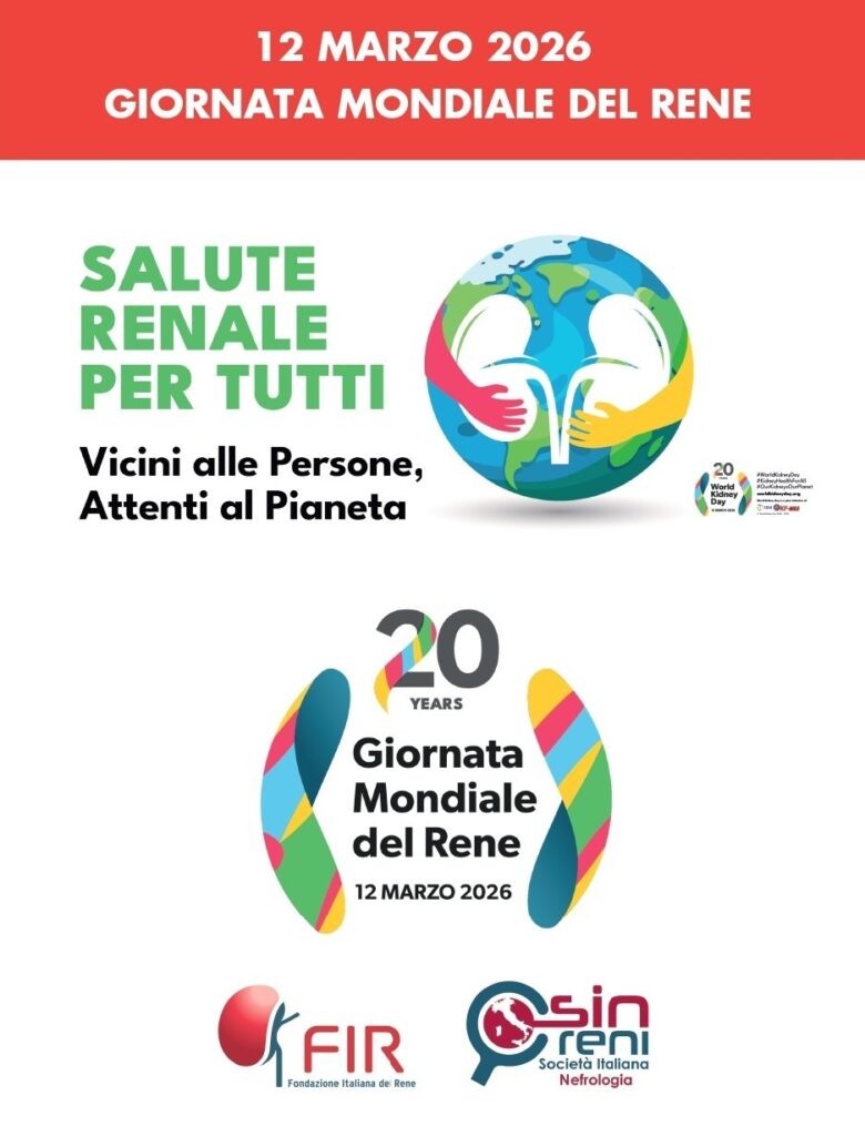 “Salute renale per tutti. Vicini alle persone, attenti al Pianeta” è lo slogan scelto per la campagna 2026 promossa a livello mondiale dalla Società Internazionale di Nefrologia (ISN) e dalla Federazione Internazionale delle Fondazioni Renali (IFKF-WKA) con l’adesione in Italia della Società Italiana di Nefrologia (SIN) e della Fondazione Italiana del Rene (FIR), per sensibilizzare la popolazione sull’importanza della salute renale, favorire la diagnosi precoce delle malattie renali e promuovere corretti stili di vita e prevenzione.