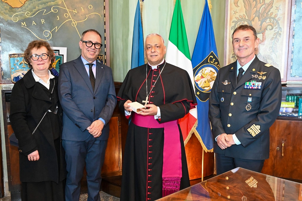 da Sinistra: S.E. Rev.ma Mons. Giuseppe Satriano – Arcivescovo di Bari, Roberto Giurano, Elena Fioritti, Gen. S.A. Francesco Vestito – Comandante del Comando Scuole AM/3° Regione Aerea.