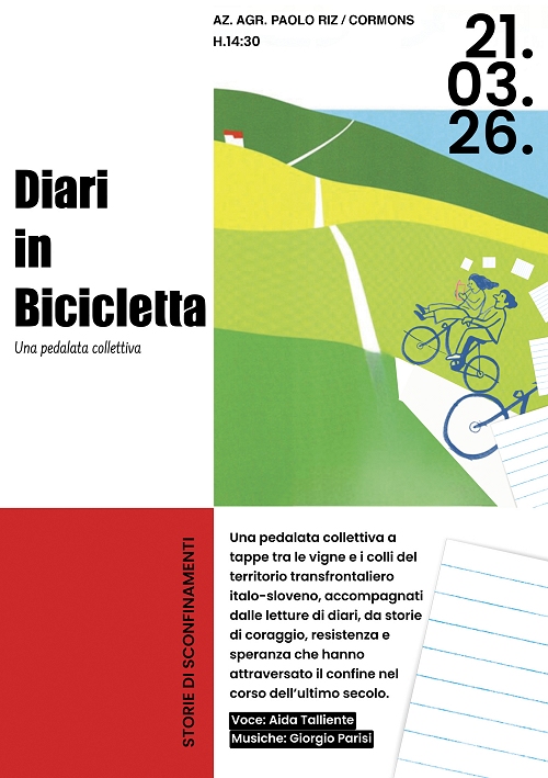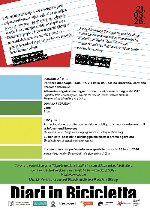Una pedalata collettiva tra le vigne e i colli del territorio transfrontaliero italo-sloveno, accompagnati dalle letture di diari che raccontano la complessità storica di questo confine nel corso dell’ultimo secolo. Sarà un’esperienza unica “Storie di sconfinamenti. Diari in bicicletta”: l’iniziativa farà parte del progetto “Migrart: Srotolare il confine”, curato dall’associazione Menti Libere, in collaborazione con l’Archivio diaristico nazionale di Pieve Santo Stefano, Casa Riz e Bikeezy, e sarà realizzata con il contributo della Regione Autonoma Friuli Venezia Giulia nell’ambito di GO!25.