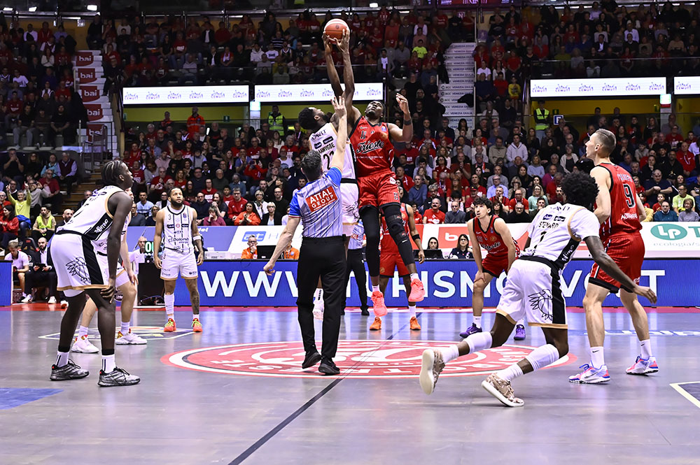 Sissoko subisce un antisportivo di Bayehe e segna due liberi. Toscano-Anderson attacca il ferro e segna con il semigancio, poi Ruzzier lo trova nell’angolo per la tripla. Jones recupera palla ma sbaglia il contropiede ben difeso da Iannuzzi; Aldridge arriva per il tap-in. Ramsey fa uno su due ai liberi. Steward segna in post contro Ruzzier e Peyton accorcia con un tiro dalla media. Candussi fa due su due dalla lunetta, ma Steward vola in contropiede per la schiacciata. Il primo tempo si chiude 45-39.