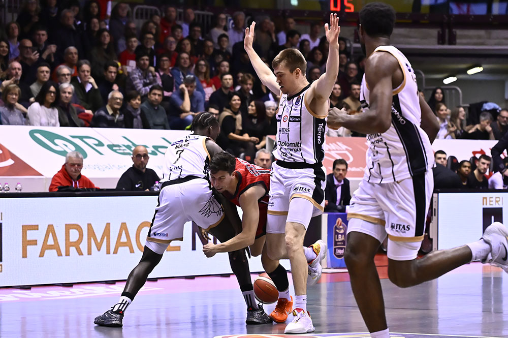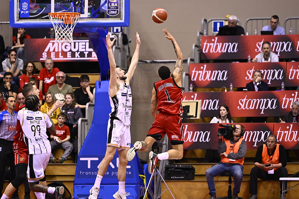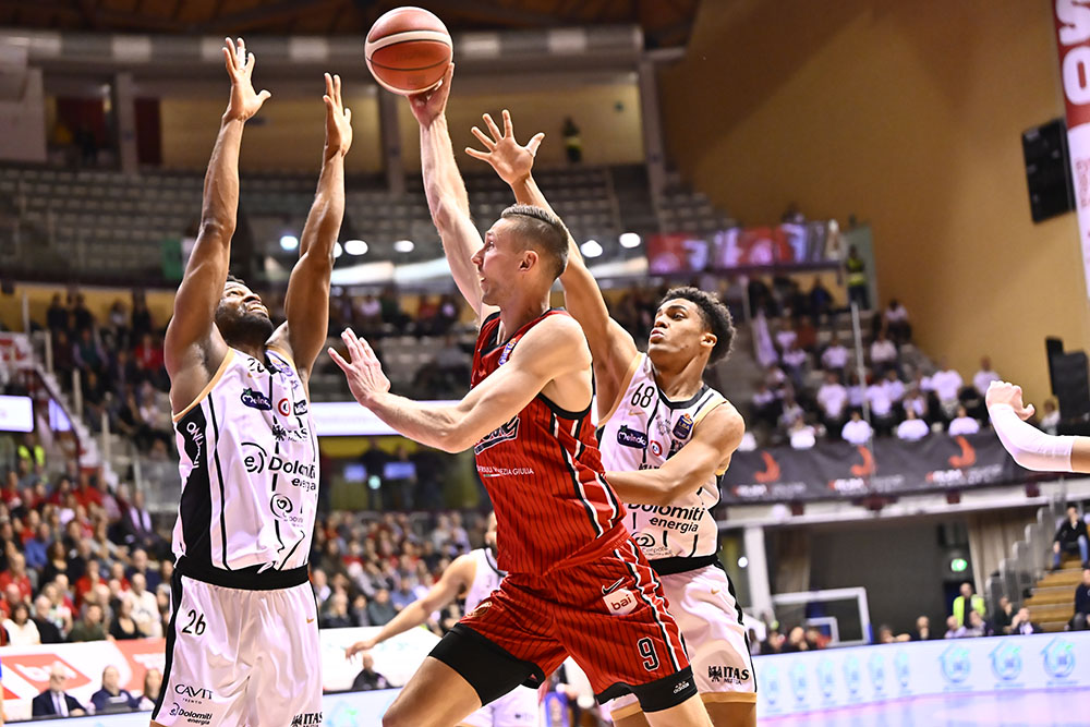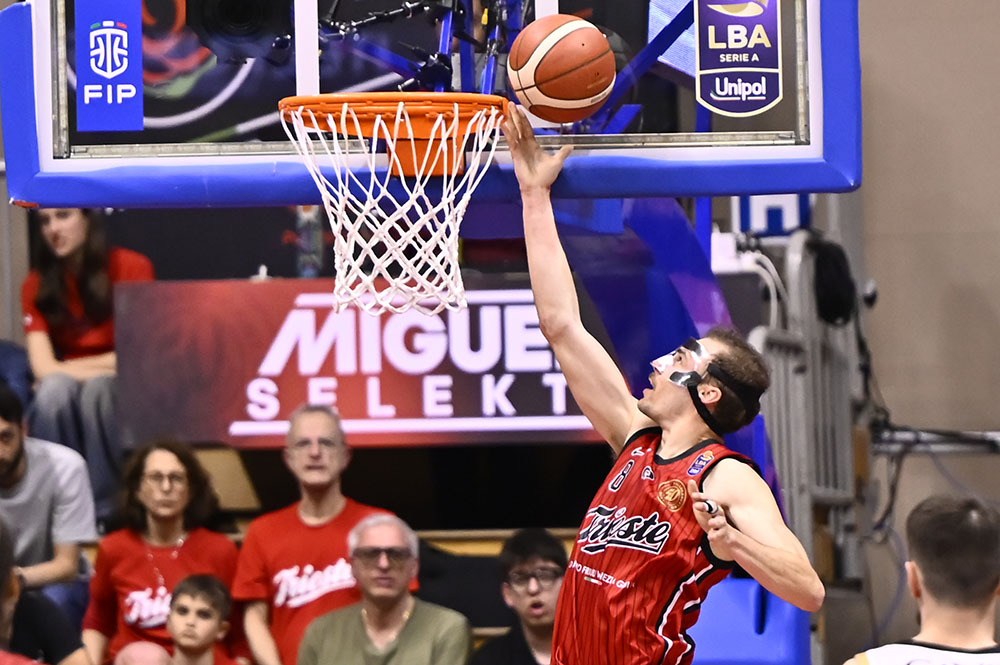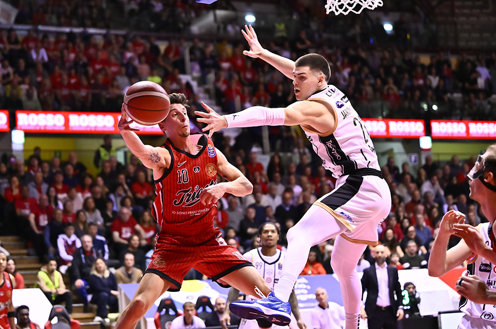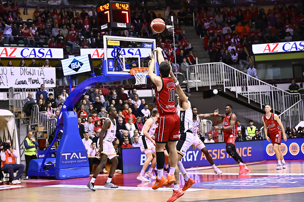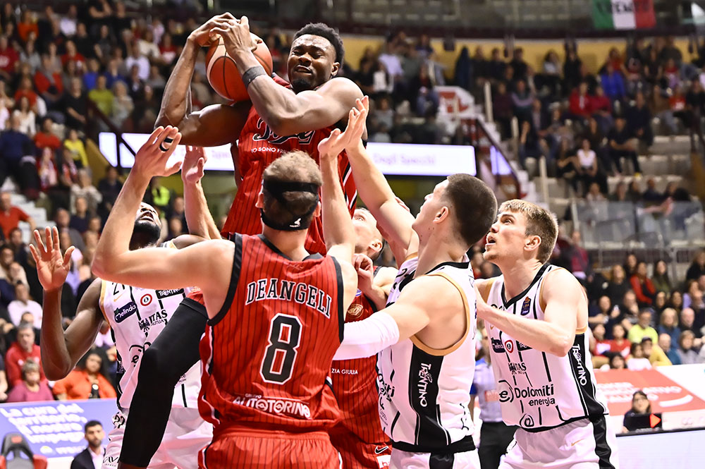 Trieste risponde con Candussi che riceve da Uthoff e segna da tre. Dall’altra parte Jogela serve Mawugbe nel pick and roll per due punti. Ruzzier trova Ramsey per la tripla, mentre Candussi segna in post con il gancio. Dalla rimessa dal fondo Ruzzier pesca Toscano-Anderson per l’alley oop del -1. Subito dopo è ancora Candussi, servito da Ruzzier, a firmare la tripla del sorpasso. Trento reagisce con Battle che in contropiede alza per la schiacciata di Jogela. Toscano-Anderson scarica per Deangeli che segna la tripla dall’angolo e la dedica alla famiglia di Matteo Babich, giovane triestino recentemente scomparso. Trento risponde con una tripla, ma Ramsey replica dall’arco. Il primo quarto si chiude 24-21.