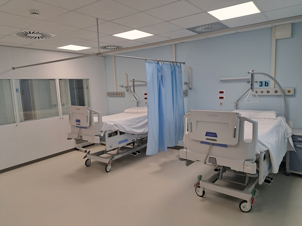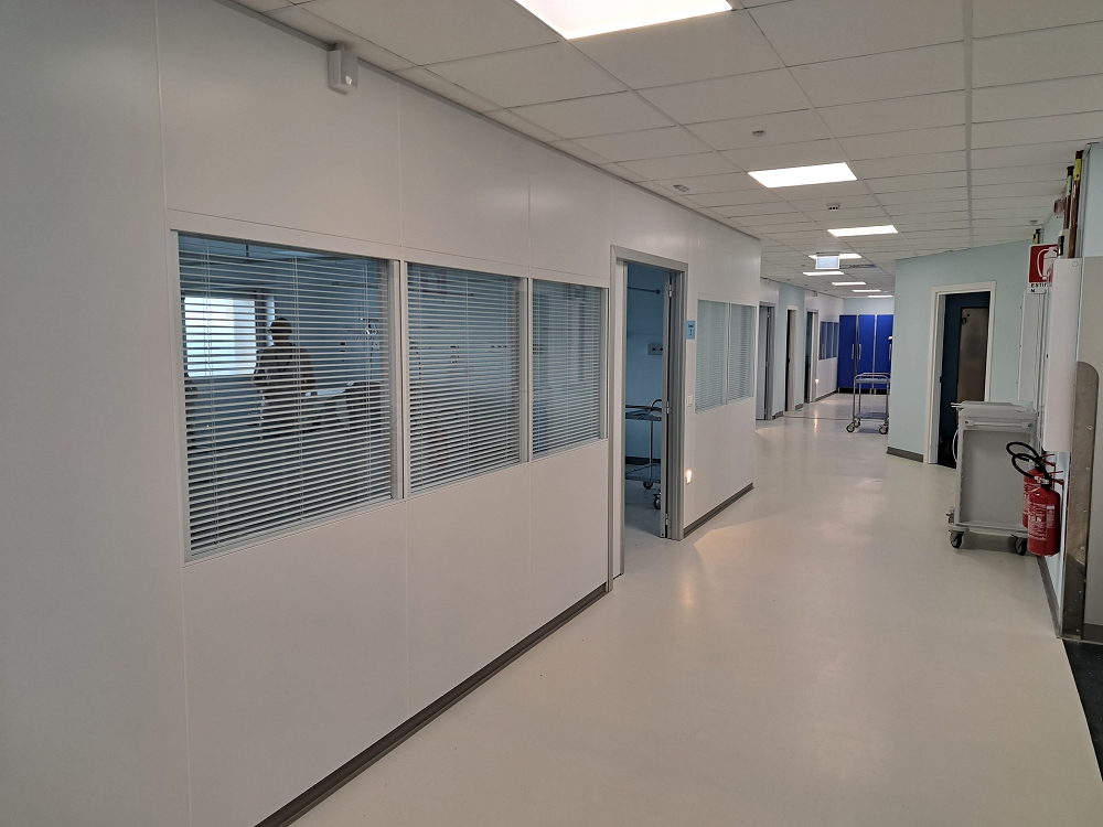 Tra le soluzioni adottate figurano pareti modulari amovibili con ampie superfici vetrate per il monitoraggio dei pazienti, sistemi di separazione nelle stanze di degenza con divisori pensili modulabili e rimovibili, pavimentazioni e controsoffitti continui compatibili con diverse configurazioni di layout e impianti tecnologici progettati per garantire prestazioni adeguate sia nell’attività sanitaria ordinaria sia in contesti emergenziali.