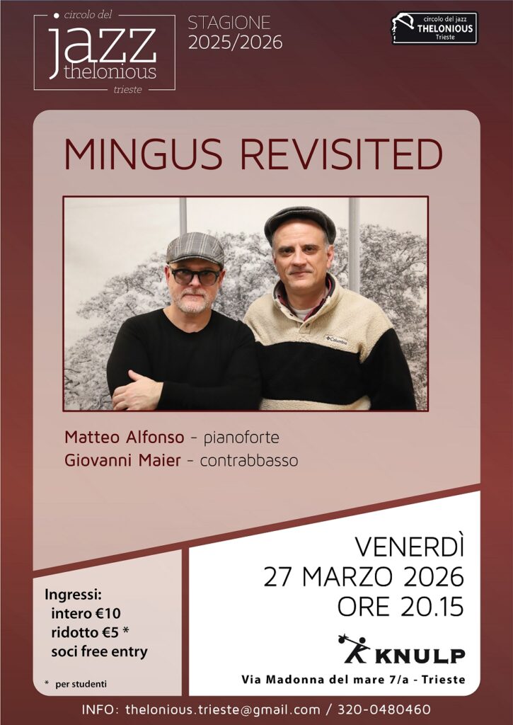 Venerdì 27 marzo alle ore 20.15 presso il Knulp in via della Madonna del mare 7/a a Trieste, il Circolo del Jazz Thelonious presenta: MINGUS REVISITED (Matteo Alfonso – pianoforte / Giovanni Maier – contrabbasso)