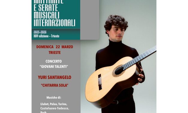 DOMENICA 22 MARZO 2026 alle ore 11.00 nella Sala Costantinides del Museo Sartorio di Trieste, Largo Papa Giovanni XXIII, YURI SANTANGELO sarà protagonista del concerto “CHITARRA SOLA”. Il 14° Concerto della XXV edizione delle Mattinate e Serate Musicali Internazionali di Trieste e 3° appuntamento dedicato ai GIOVANI TALENTI vedrà esibirsi il giovane chitarrista fiorentino YURI SANTANGELO, che si è affermato in più … Leggi tutto YURI SANTANGELO protagonista delle Mattinate e Serate Musicali Internazionali di Trieste con il concerto “CHITARRA SOLA”