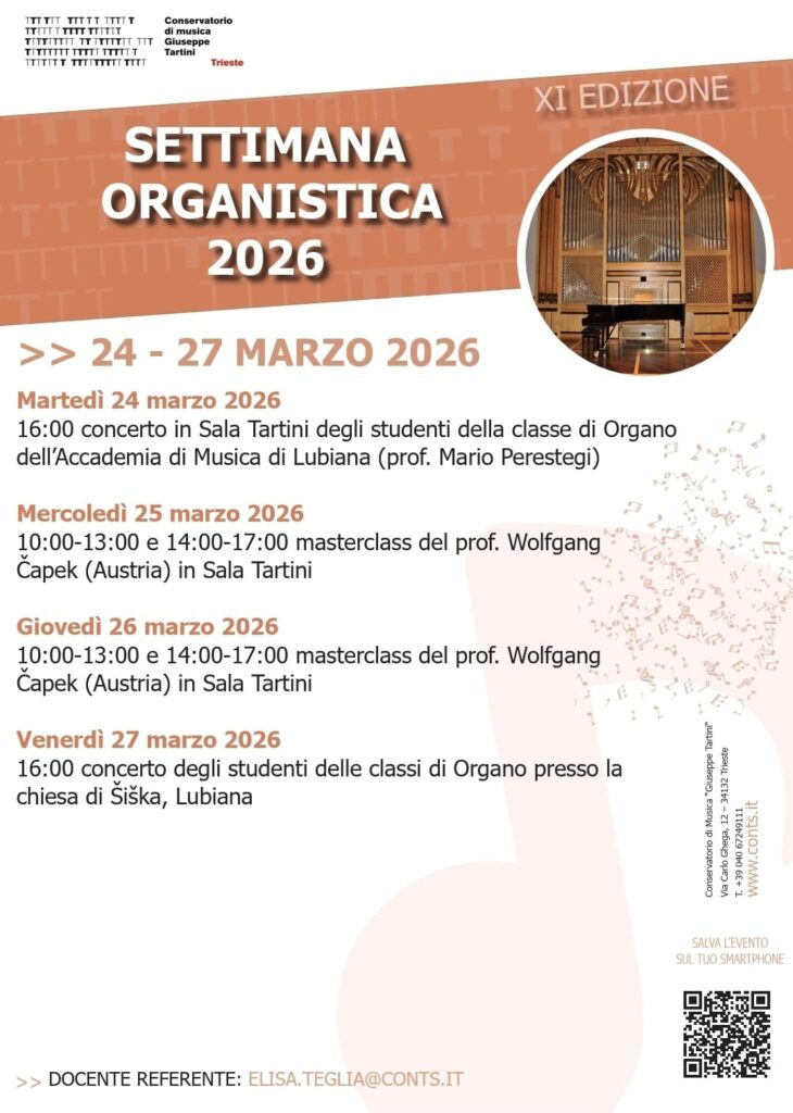 Martedì 24 marzo 2026 ore 16 presso la Sala Tartini del Conservatorio di Musica di Trieste inizierà ufficialmente l’ 11a edizione della settimana organistica organizzata dalle classi d’organo dei prof. Elisa Teglia e Manuel Tomadin con il prezioso supporto dell’Istituzione.