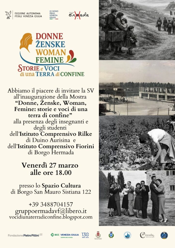 Venerdì 27 marzo alle ore 18.00, presso lo Spazio Cultura di Borgo San Mauro (Sistiana), si terrà l’inaugurazione della mostra “Donne, Ženske, Woman, Femine: storie e voci di una terra di confine”.