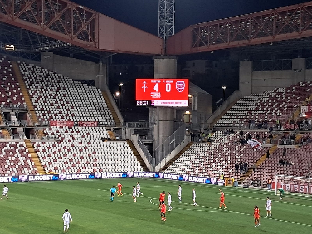 Con la Triestina già retrocessa, costretta in campionato a una rimonta impossibile per la salvezza, stante la pesantissima penalizzazione di 23 punti  e con i veronesi già certi dei playout, meravigliosa cinquina rifilata dagli uomini di Marino a una modestissima Virtus Verona, in un match senza storia oggi al Rocco.
