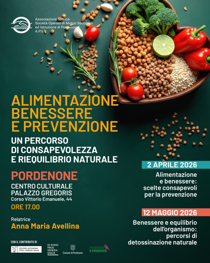 “Alimentazione, benessere e prevenzione” è il titolo del nuovo progetto divulgativo della Storica Società Operaia di Pordenone, che tra a aprile e maggio proporrà un ciclo di incontri dedicati a un percorso di consapevolezza in tematiche legate all’alimentazione naturale e al benessere, realizzato grazie al sostegno della Regione Friuli Venezia Giulia e del Comune di Pordenone, all’interno del cartellone “Primavera a Pordenone”.