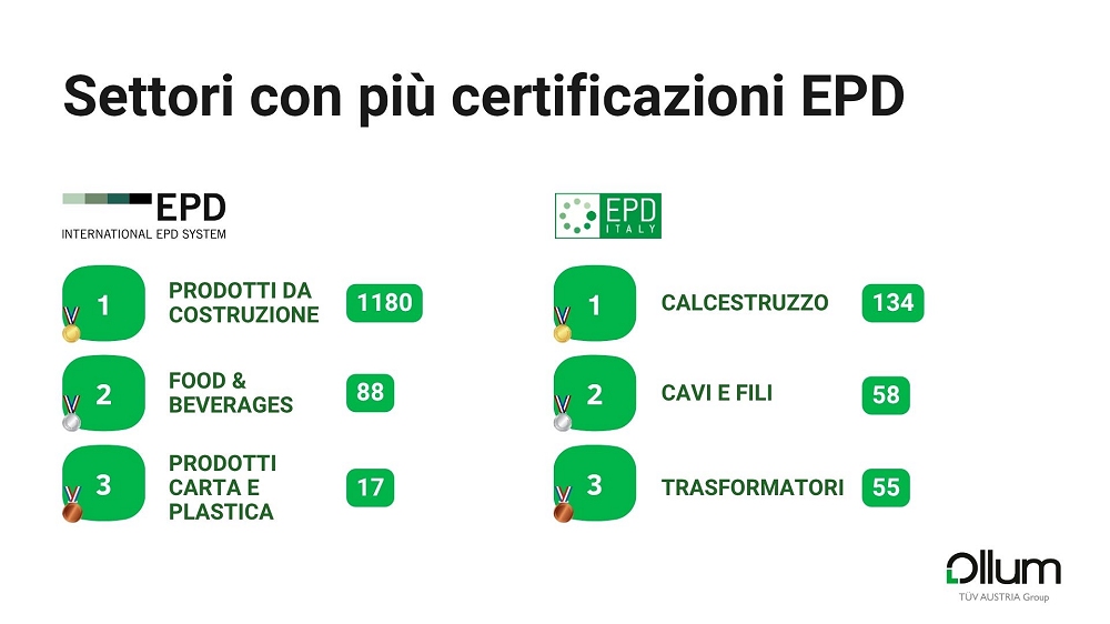 Anche nel contesto italiano il trend è confermato. I calcestruzzi guidano la classifica con 134 EPD, seguiti da cavi e fili (58) e trasformatori (55).