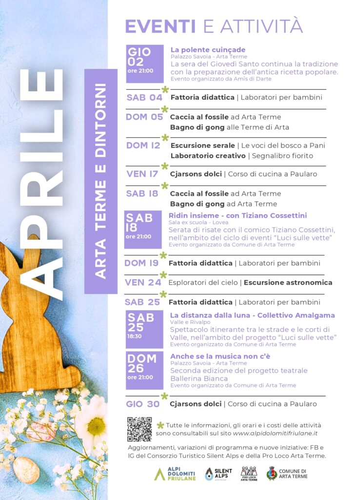 Tra gli appuntamenti da segnalare: il 18, caccia al fossile e bagno di gong per chi vuole esplorare il territorio o rigenerarsi. Il 18, serata di comicità friulana con Tiziano Cossettini alla Sala ex scuola di Lovea, nell’ambito del ciclo “Luci sulle vette”. Il 25, lo spettacolo itinerante del Collettivo Amalgama tra le strade e le corti di Valle sara organizzato nel contesto dello stesso ciclo, e il 26 si terra la seconda edizione del progetto teatrale “Ballerina Bianca” al Palazzo Savoia con “Anche se la musica non c’è”. Il 17 e il 30 aprile, a Paularo, due occasioni per imparare a preparare i cjarsons dolci con un corso di cucina tradizionale. Le famiglie troveranno anche due appuntamenti con la Fattoria didattica e i suoi laboratori per bambini (19 e 25 aprile).