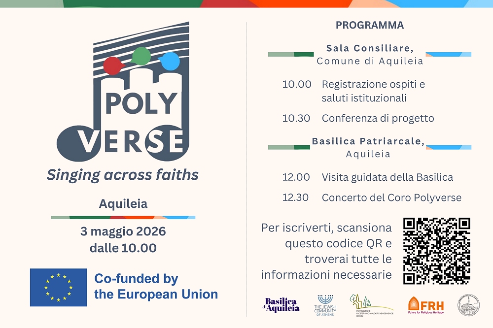 Un canto corale, nato dalle esperienze di quattro confessioni religiose diverse, unite come esempio virtuoso di pace interreligiosa. È questo il cuore di Polyverse, progetto sostenuto dal programma Europa Creativa dell’Unione Europea e che vede come lead partner a livello continentale la Basilica Patriarcale di Aquileia. Insieme a questa, sito UNESCO dal 1998 e tra i più antichi luoghi di culto cristiano ancora in funzione al mondo, hanno lavorato la Comunità Ebraica di Atene, l’Abbazia evangelica di Lehnin in Germania e la Grande Moschea di Roma, insieme al Future for Religious Heritage e all’agenzia di progettazione europea Argo.