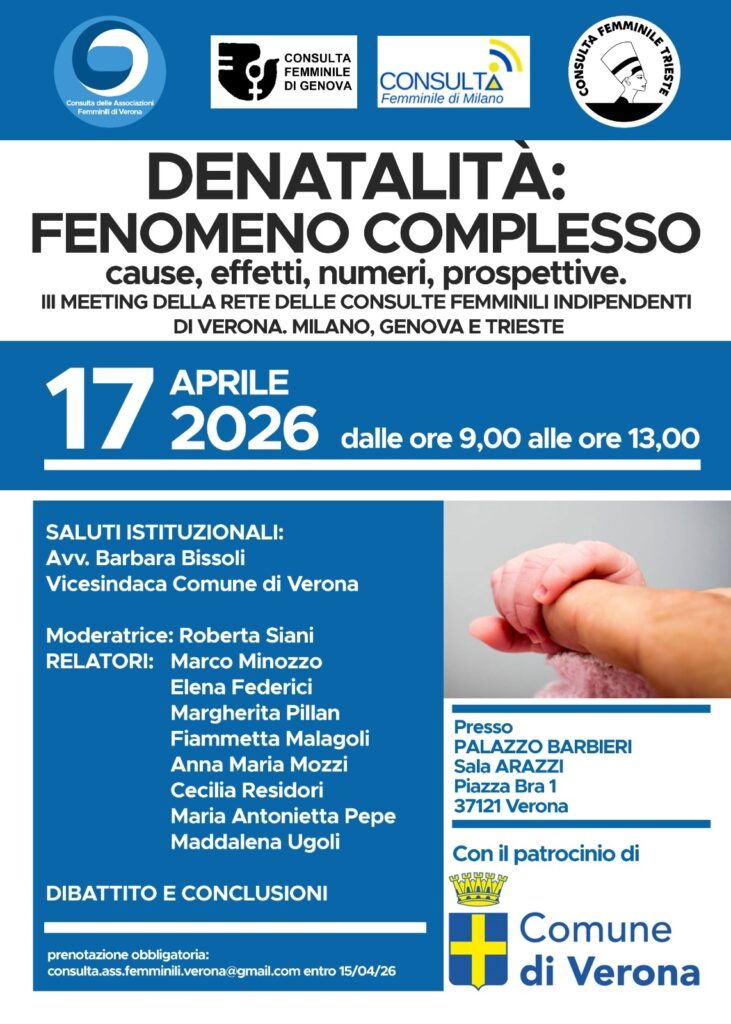 Venerdì 17 aprile si svolge presso il Municipio di Verona -palazzo Barbieri- un convegno delle Consulte Femminili indipendenti di quattro grandi città dell’Italia del nord: Milano, Genova, Verona e Trieste.