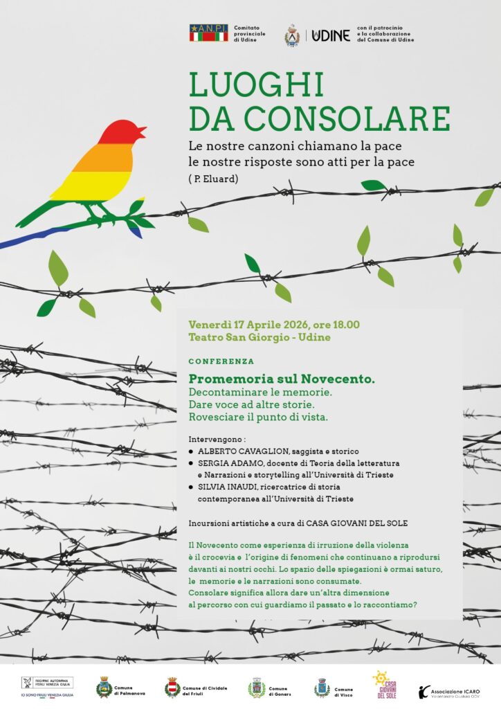 Nel percorso di avvicinamento al 25 aprile, la conferenza udinese vuole ribadire l’attualità della memoria come strumento di consapevolezza civile. «L’obiettivo è restituire voce alle storie che rischiano di essere dimenticate, aprire spiragli di futuro dentro un passato che ancora ci interroga. Sarà un’occasione per fermarsi, ascoltare, riflettere. Consolare, parola che noi dell’ANPI abbiamo voluto reinterpretare in chiave contemporanea partendo dalla rigenerazione di quei luoghi del Novecento a lungo dimenticati e fino ad oggi poco accessibili, come ad esempio i campi di concentramento fascisti di Visco e Gonars o la Caserma Piave di Palmanova, attraverso diverse forme di narrazione e di arte, rapportandoci così alla memoria storica in modo nuovo, liberandola dalla retorica e dalla ritualità.» osserva Antonella Lestani, presidente provinciale ANPI Udine.