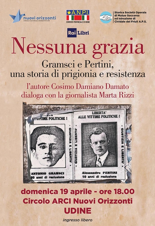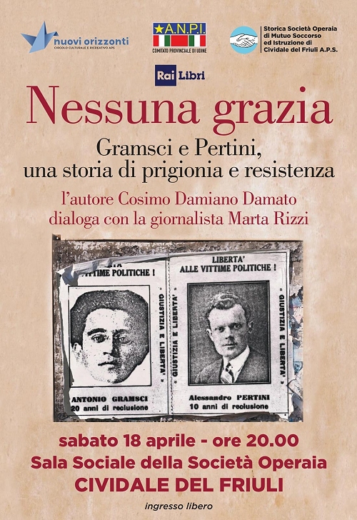 Il regista e scrittore Cosimo Damiano Damato arriva in Friuli questo weekend per presentare il suo romanzo “Nessuna grazia. Gramsci e Pertini, una storia di prigionia e resistenza” (Rai Libri, 2025) proposto per il Premio Strega 2026. Sabato 18 aprile, alle 20.00, sarà alla SOMSI (in piazza Foro Giulio Cesare, 14) di Cividale del Friuli. Poi, domenica 19 aprile, alle 18.00, sarà protagonista al circolo Nuovi Orizzonti (in via Brescia, 3) di Udine. Nel corso dei due appuntamenti, in dialogo con la giornalista Marta Rizzi, l’autore offrirà un ritratto approfondito di due figure fondamentali della storia italiana. Perseguitati dal regime fascista, nel 1930 l’onorevole comunista Antonio Gramsci e l’avvocato socialista Sandro Pertini condivisero quasi un anno di prigionia, nel carcere pugliese di Turi. Dopo un’iniziale diffidenza, dovuta alle diverse opinioni politiche, tra loro si sviluppò una fraterna amicizia.