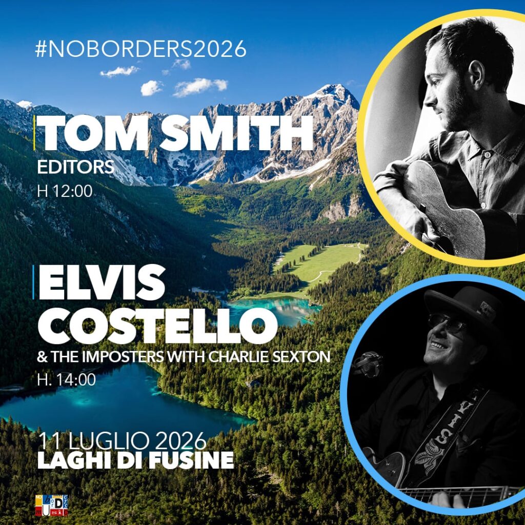 La 31ª edizione del No Borders Music Festival annuncia un nuovo doppio appuntamento con la musica nel Tarvisiano: sabato 11 luglio 2026 ai Laghi di Fusine alle ore 11.00 si esibirà Tom Smith (Editors), seguito alle ore 14.00 da Elvis Costello & The Imposters with Charlie Sexton.
