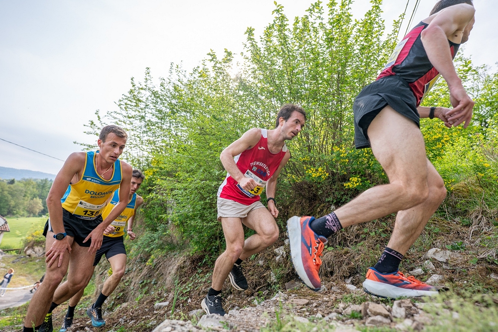 Più combattuta la gara maschile, disputata sulla distanza di 10 chilometri (per 500 metri di dislivello positivo), con un bel duello tra il bellunese Lorenzo De Vettori (Atletica Dolomiti) e il trevigiano Roberto Fregona (Trevisatletica), con quest’ultimo a imporsi in 41’59”, precedendo De Vettori di 15”. In terza posizione il cadorino Giovanni De Bon, staccato di 35”.