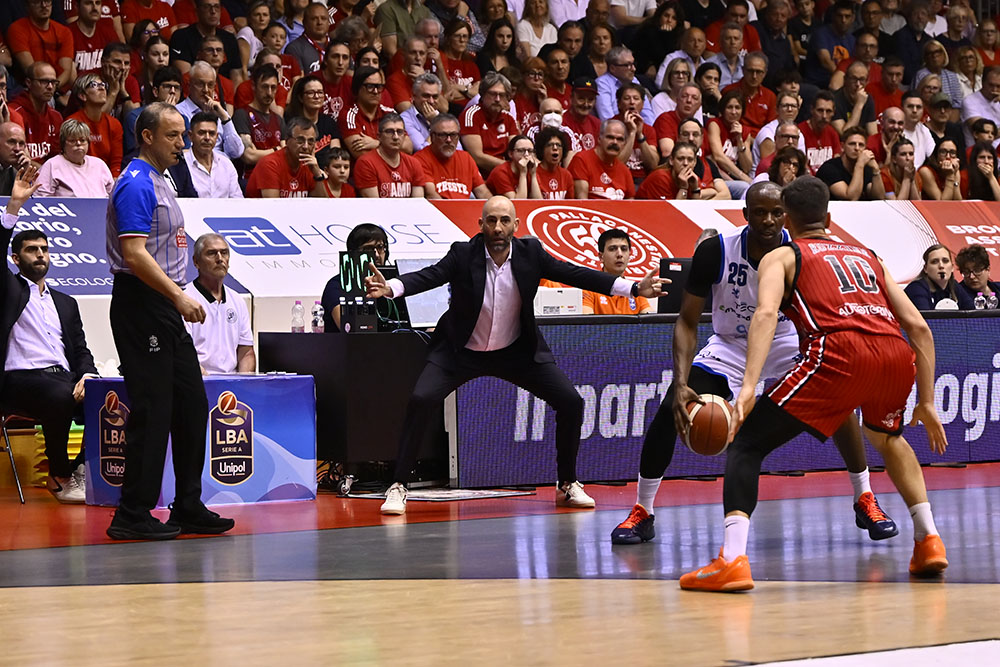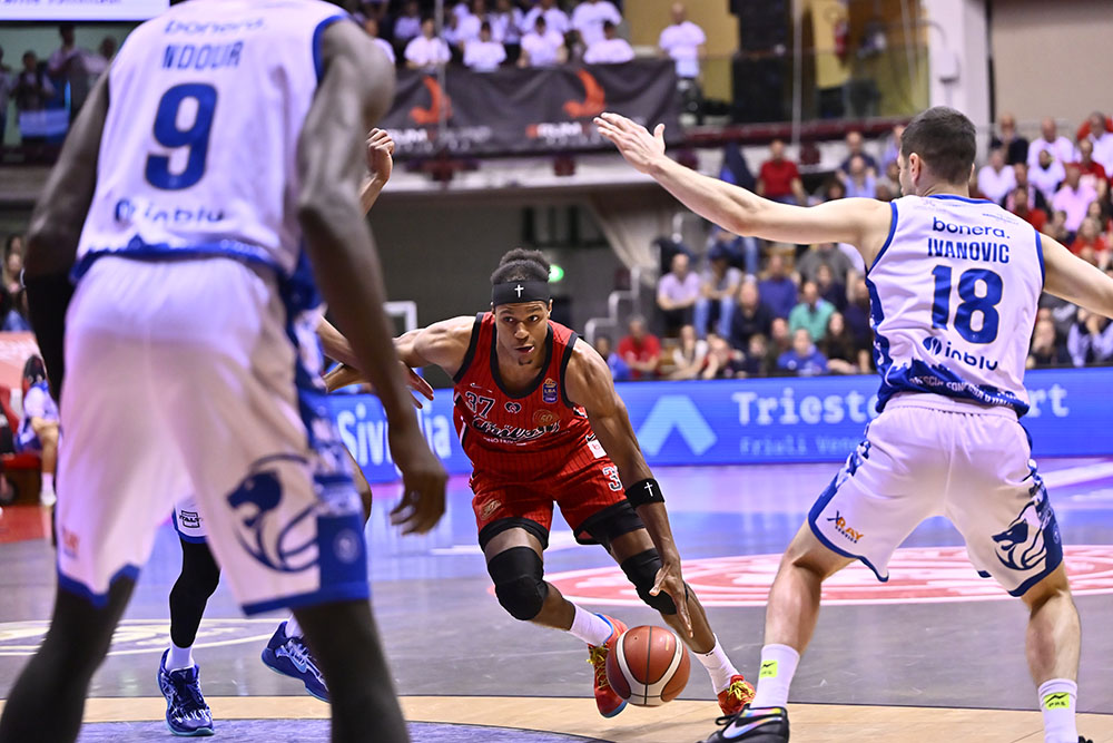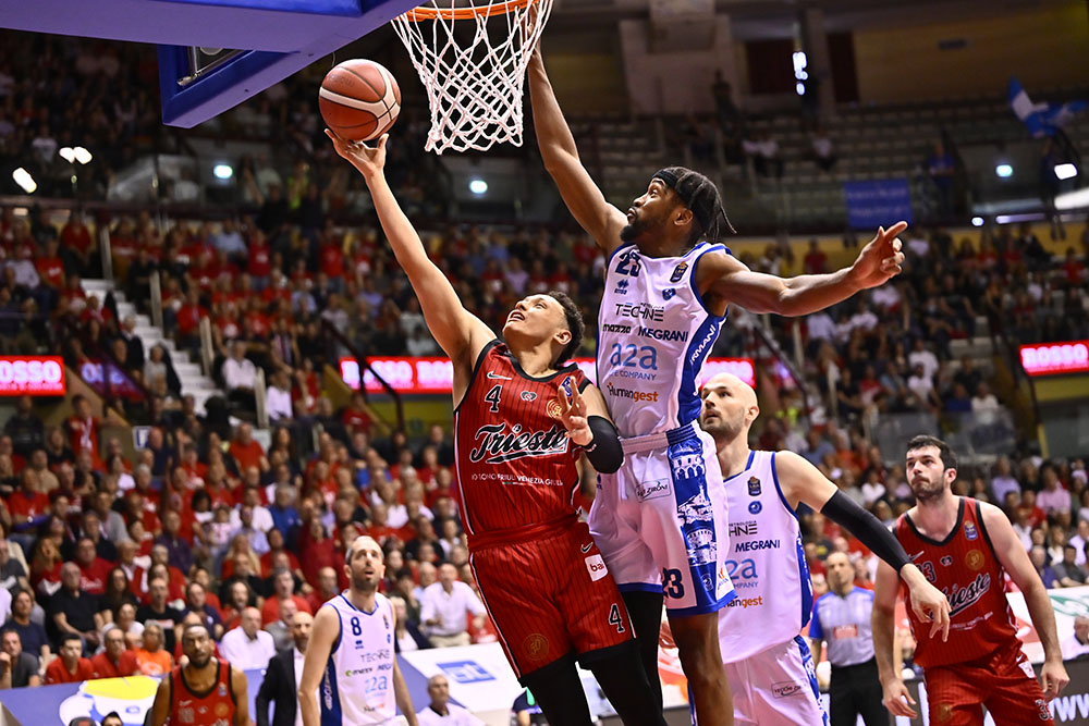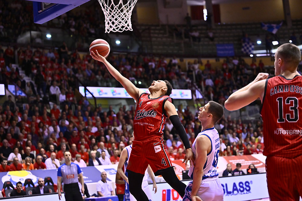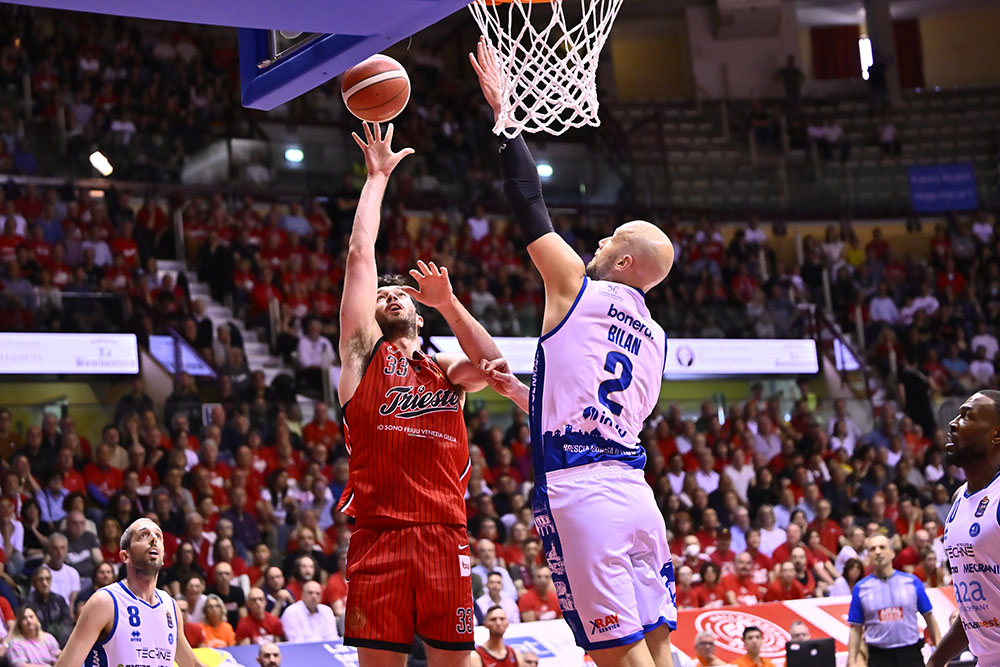Quarto quarto. Per il finale Trieste schiera Ruzzier, Ramsey, Deangeli, Uthoff e Toscano-Anderson. Uthoff apre con una tripla, ma Ivanović risponde con un floater seguito dal tap-in di Mobio. Lo stesso Ivanović segna poi la tripla del -1, mentre Burnell firma una schiacciata dopo un recupero su passaggio di Ramsey. Cournooh segna la tripla del sorpasso, Brown riceve un tecnico per proteste e Burnell realizza il libero. Toscano-Anderson reagisce con una tripla, Bannan fa 1/2 ai liberi e JTA segna ancora in penetrazione. Brescia però reagisce con Burnell che colpisce da tre, Bannan risponde dalla distanza, ma Bilan segna da sotto e Ivanović realizza la tripla del nuovo vantaggio. Bilan esce per cinque falli e Ross accorcia dalla lunetta, ma Burnell è decisivo: segna una tripla, recupera palla e schiaccia in contropiede. Nel finale Ramsey fa 2/2 ai liberi, Rivers risponde allo stesso modo e l’ultimo tentativo di Trieste non va a segno: la gara si chiude sull’82-86.