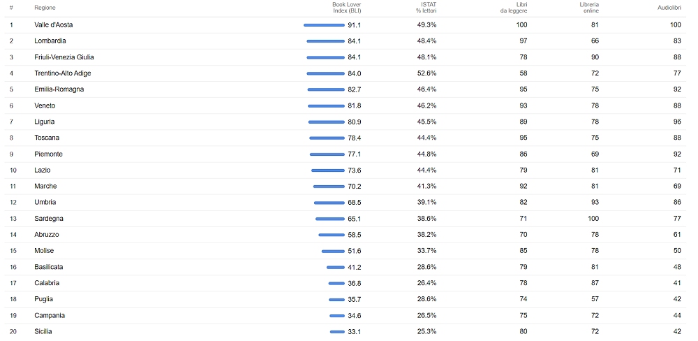 Con il 48,1% dei residenti che ha letto almeno un libro nel tempo libero nell’ultimo anno, il Friuli-Venezia Giulia è quarta in Italia per quota di lettori secondo l’ISTAT. Nel BLI sale al terzo posto con un punteggio di 84,1 su 100 — a pari merito con la Lombardia — grazie a un profilo equilibrato e solido su tutti e tre gli indicatori Google Trends.