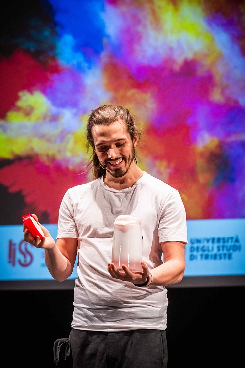 Il primo classificato di quest’anno, Pietro Monti-Guarnieri, è studente di dottorato in fisica delle astroparticelle all’Università di Trieste e INFN Trieste. Entusiasmo, umorismo e tanta energia sono le caratteristiche di Pietro, che ha saputo raccontare in modo insolito e coinvolgente gli effetti e le applicazioni della fisica dei raggi cosmici, dai processi climatici e la “creazione” di nuvole, alla tomografia muonica.
