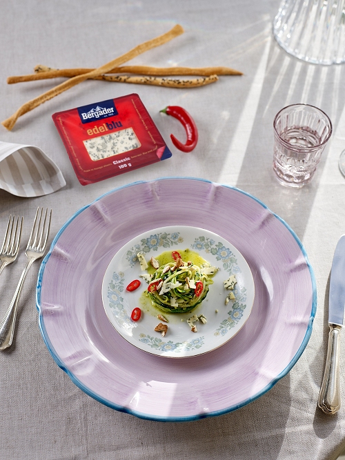 A rendere il piatto ancora più interessante è l’incontro tra le fresche zucchine di stagione, le erbe selvatiche e il carattere deciso dell’erborinato Edelblu Bergader, che aggiunge profondità e armonia, richiamando i profumi e i sapori della tradizione alpina. Il risultato è un equilibrio gustativo sorprendente, capace di esaltare ogni singolo ingrediente.