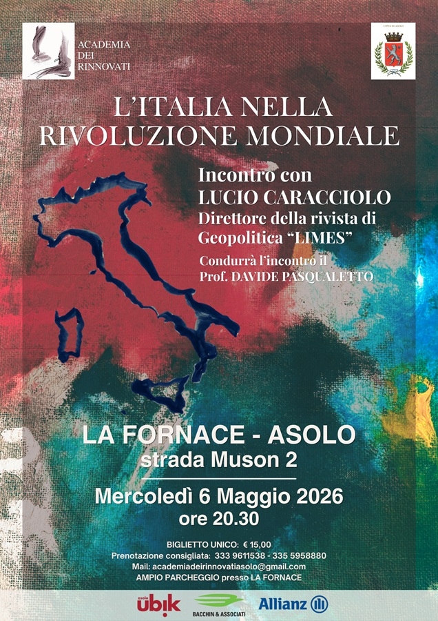L’Academia dei Rinnovati di Asolo prosegue il proprio percorso di interpretazione della società attuale con un nuovo incontro e un altro grande ospite: dopo Gian Antonio Stella, Ferruccio De Bortoli, Giovanni Costa, Paolo Crepet e molti altri, grazie ai quali ha indagato le tematiche più calde della contemporaneità, mercoledì 6 maggio alle 20.30 alla Fornace di Asolo (strada Muson, 2 – Asolo, Treviso) promuove l’incontro con il fondatore e direttore della rivista di geopolitica Limes Lucio Caracciolo*, intitolato “L’Italia nella rivoluzione mondiale” (che è anche il titolo del numero di Limes del 13 febbraio 2026).