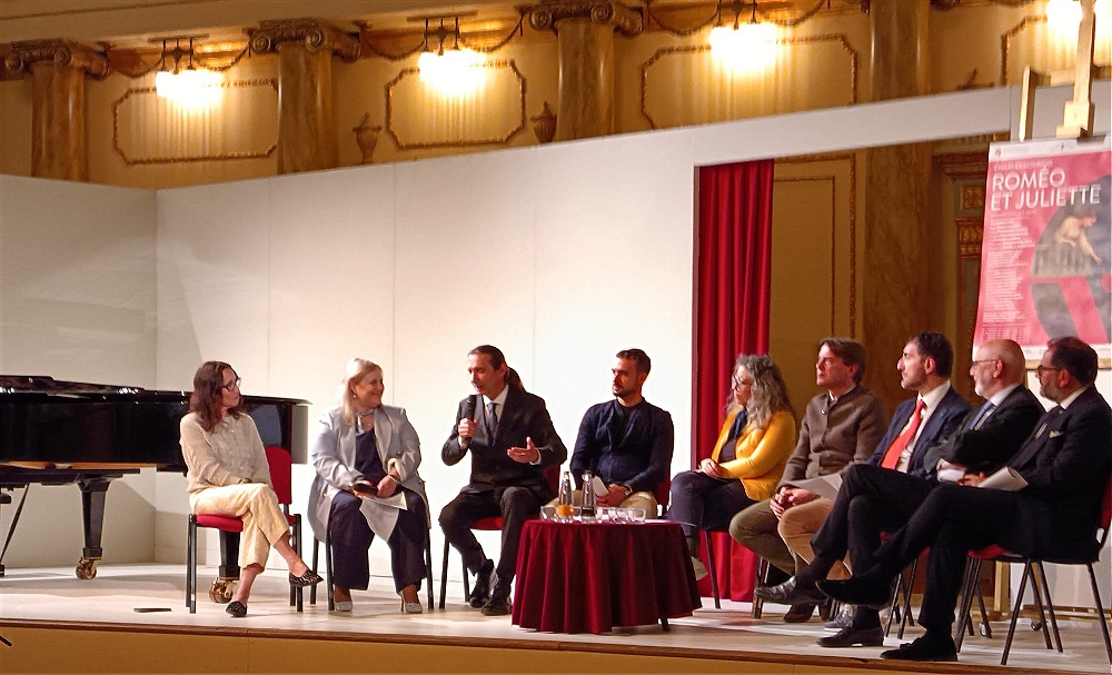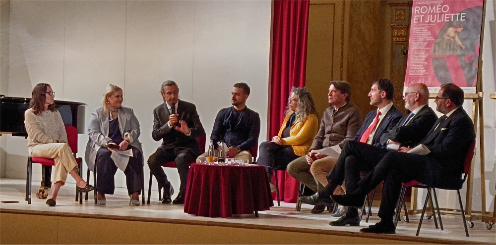 Poi il Direttore artistico Vicari prende la parola per parlare di Gounod ed ha ricordato che quest’opera nata nel 1841dopo aver avuto una lunga gestazione dove era previsto anche un balletto, questa di oggi in presentazione si potrebbe chiamare la versione “Trieste”. Infatti si è ricordato quanto sia stata lunga la gestazione del “Roméo et Juliette” di Charles Gounod. Il compositore francese aveva iniziato a scriverla nel 1841, durante un suo soggiorno a Roma. L’opera venne conclusa nel 1865, in Francia, su un nuovo libretto di Jules Barbier e Michel Carré. L’opera ha subito diverse rivisitazioni fino a quella finale del 1888. Al Verdi vedremo infine un’edizione “triestina” sia per la prosa che per l’opera, molto vicini a Trieste ha poi commentato Valerio, sottolineando il suo amore verso questa città e le sue vicende storiche, città che in fondo rispecchia e ha vissuto i due temi centrali del “Romeo e Giulietta”: l’amore e la morte e qui in entrambe le opere, Mercuzio, l’amico del cuore di Romeo, gioca un ruolo essenziale per la narrazione e il phatos: è incomprensibile, puro, indecifrabile a volte. Un protagonista non proprio secondario che descrive l’amore come una sorta di malattia e che, dopo lo scontro fatale con il fratello di Giulietta, finirà inevitabilmente nella tomba e che parla della malattia che porta l’amore. Una figura che introduce la fatale interconnessione tra amore e morte, il tema di questo dramma che ha seguitato a ispirare artisti e musicisti per secoli.
