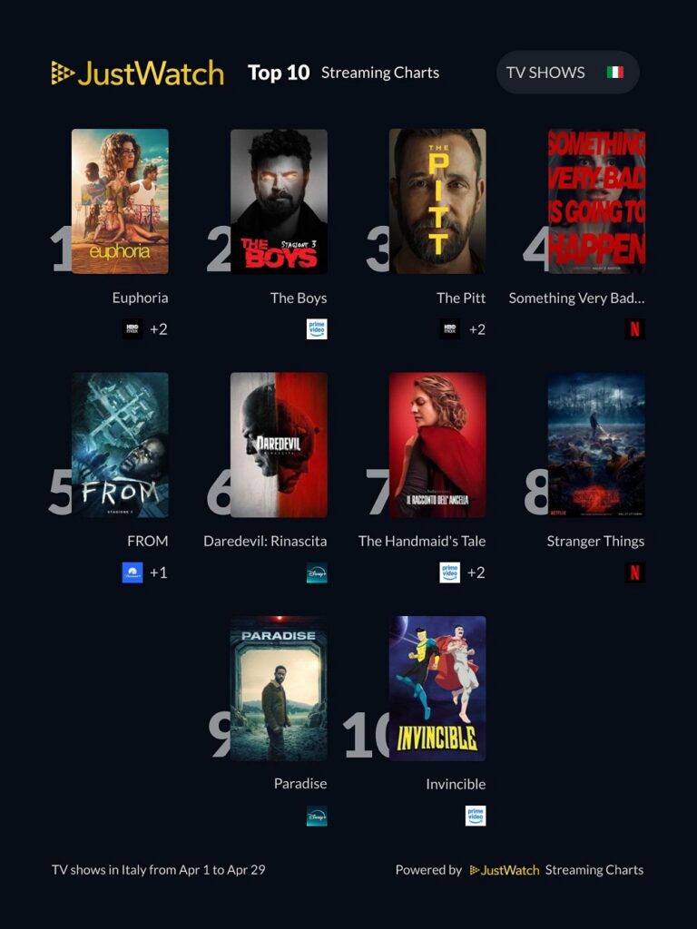 Ad aprile 2026 la classifica delle serie TV più seguite in Italia cambia volto, con diversi ritorni importanti: a conquistare la vetta è Euphoria, seguita da The Boys e da The Pitt, che scende al terzo posto.